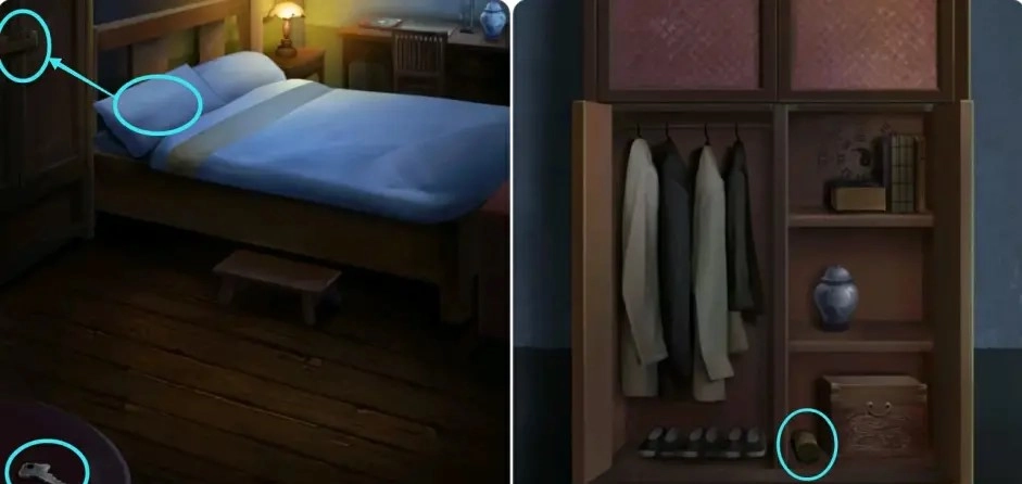 和道长的对话结束后,你走进了左边的厢房。根据系统教学的提示,你从枕头下面翻出了钥匙一,用这把钥匙打开衣柜,取走了里面的香。之后,你又在桌子上发现了钥匙二。