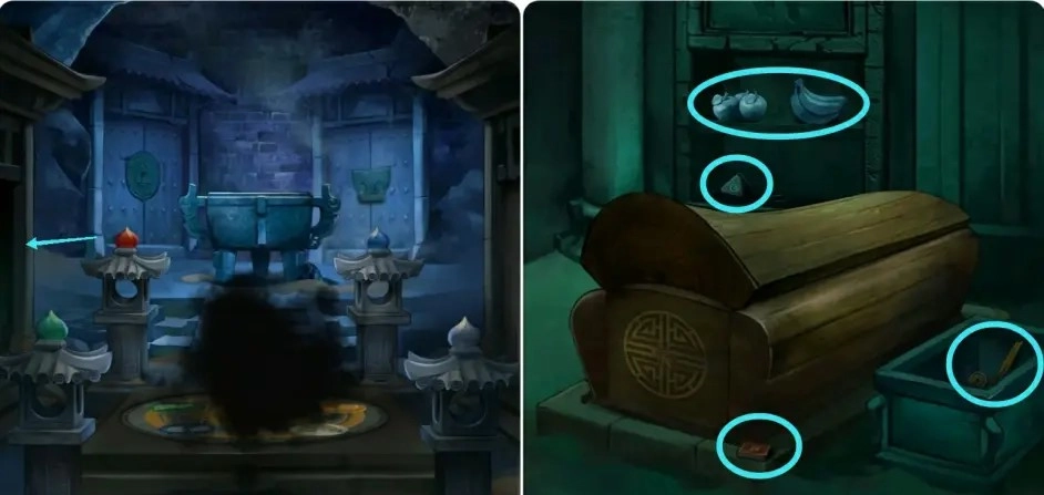 1、踏入墓穴后,前往左一墓室,顺手拿走散落在墓室中的石苹果、石香蕉、三角形吊坠、火柴、香和铜板。