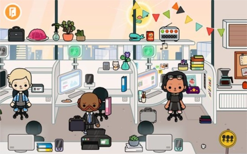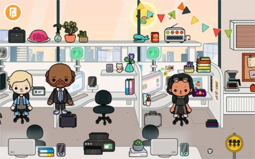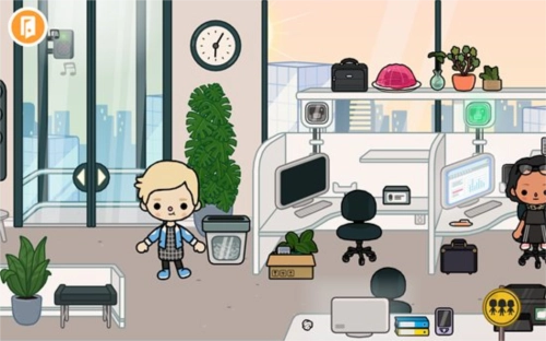 我们随意点击一栋大楼就能进入内部,比如挑选商业楼宇,进入后会看到里面是一间办公室,能瞧见不少办公用品,还有许多正在工作的人员。