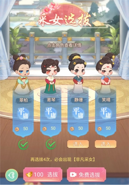 玩家点击右下角的“选拔”按钮,就能开展采女选拔工作,挑选合适的采女入宫任职。