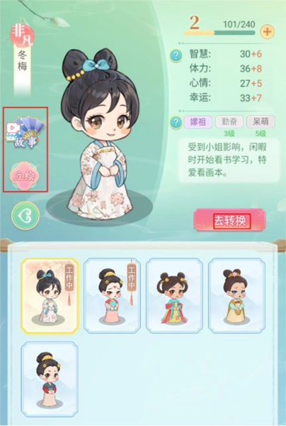 完成采女选拔后,角色会成为宫女。玩家可在宫女页面查看相关信息,包括专属故事和立绘。