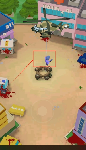 在战场地图里,操控蓝衣角色移动到红框标注的石堆掩体后方,与此同时留意头顶直升机的动向,为发起进攻或者规避敌方火力做好准备。