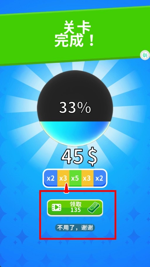 关卡结束后,你可以选择观看广告来获取奖励,也可以点击“不用了,谢谢”直接结束当前关卡。