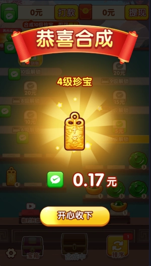 能成功到账的,游戏里每次解锁合成新珍宝都会得到红包奖励,前期合成出3级和4级珍宝时还能额外获取两次提现机会,分别能提0.12和0.24到微信账户,实际测试是秒到账呢!之后就得合成更高等级的珍宝才有机会,另外还有红包能按比例到账,最低提现门槛是0.38。