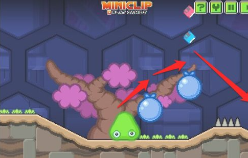 操控粘液跳到气球上,接着避开钉刺,下方是无法通行的!
