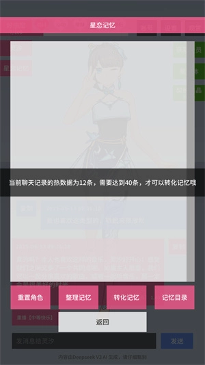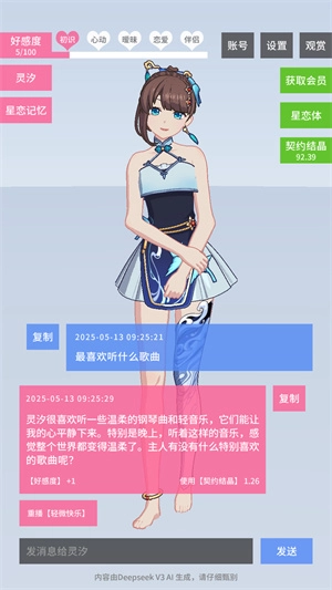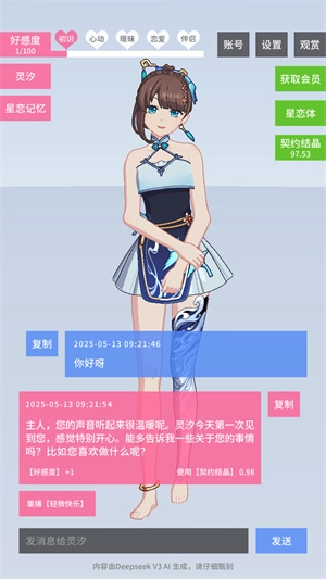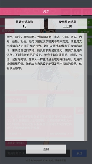 训火开发的陪伴类互动游戏,其对话功能接入了两种AI大数据模型,用户可依据自身需求进行选择。每次进行对话都会消耗星恋结晶,其中回复速度较慢的模型消耗的数量相对较少,而回复速度快的模型消耗则会多一些。并且,随着对话的逐步深入,所需消耗的星恋结晶数量会慢慢增加。用户可以自由地展开各种话题,就如同与普通AI聊天一样。