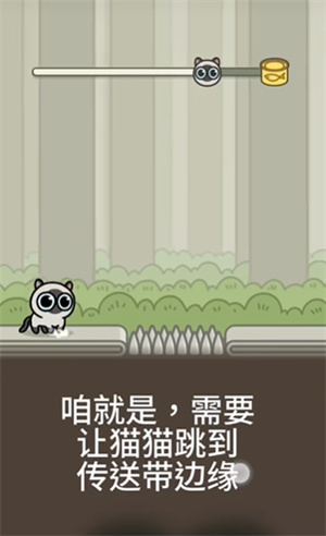 后面的传送带中间会冒出尖刺,得让猫咪跳出最远的距离才能通过,而且要等尖刺缩下去的时候才行。