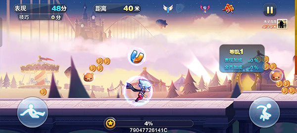 进入游戏后,会看到两个按键,一个是滑铲键,另一个是跳跃键,这两个按键都可用于躲避游戏里的障碍和拾取金币。我们的目标是尽量跑得更远,以此获得更高的分数。