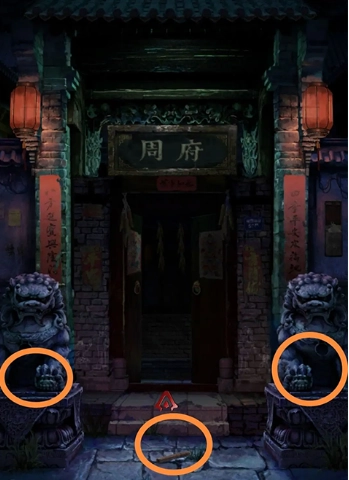 1、在周府门外捡到了尚未点燃的火折子,府邸大门左侧的石狮子身上还嵌着一块阳玉佩。