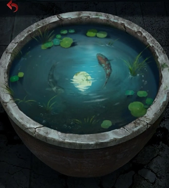 4、与阿婆交谈后,将阴阳玉佩交给她,以此换来一包鱼饲料。把鱼饲料撒到庭院里的大缸中,缸里会映出月亮的影子,这时用勺子去舀,就能得到黄珠子。