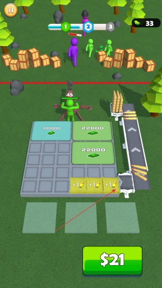 1、绿色小人操控枪械,借助右侧箭形武器对前方敌人发起攻击,要留意上方进度条的推进情况,积累100000这类数值,以此获取资源。