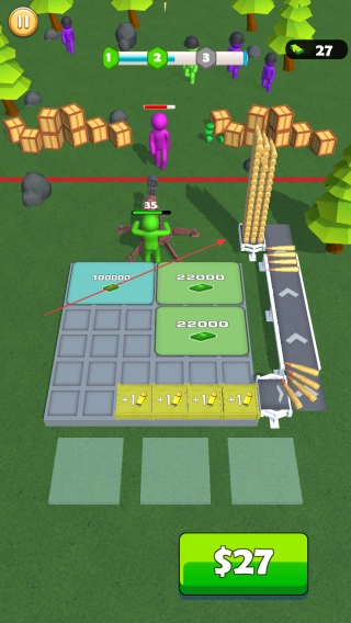 3、绿色小人持续用枪械与右侧武器攻击敌人,留意上方进度条,借助+1等道具增强攻击,消灭敌人可获得$27奖励。
