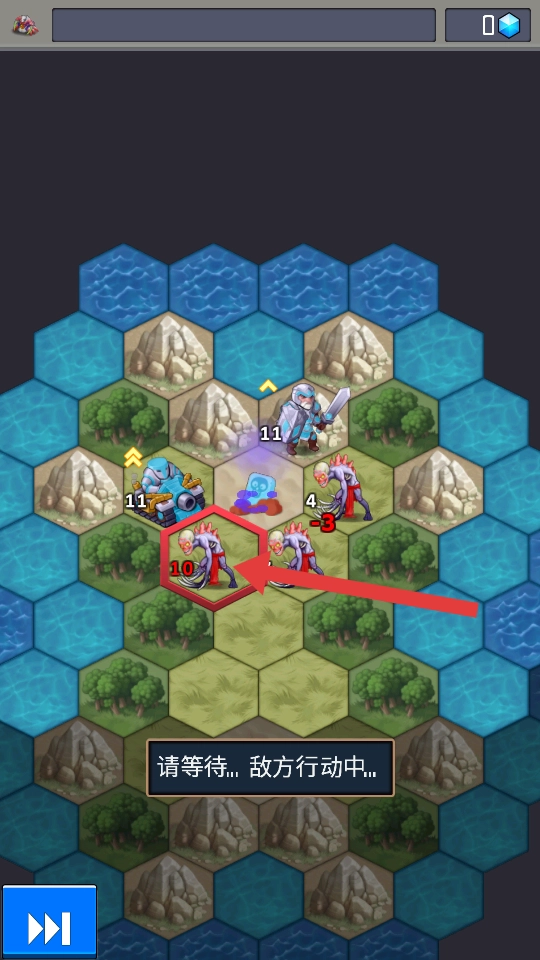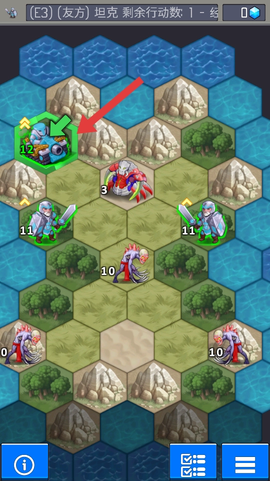 1、进入六边形网格战场后,先观察友方坦克、士兵的初始位置以及敌方巨钳兽的分布情况,优先把坦克部署在前线位置。