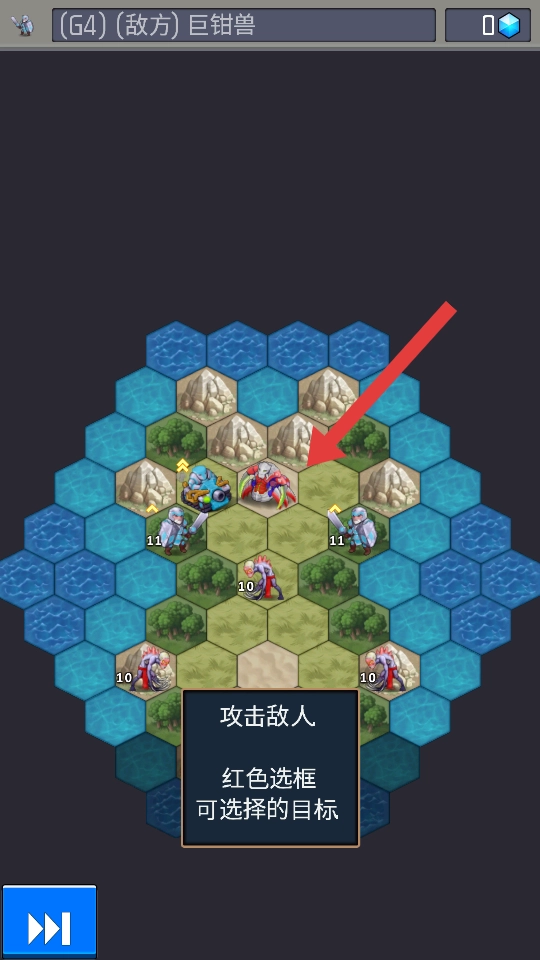 2、战斗操作技巧方面,依据红色选框给出的可选目标提示,精准锁定敌方巨钳兽,优先对敌方防御能力较弱的单位发起攻击。