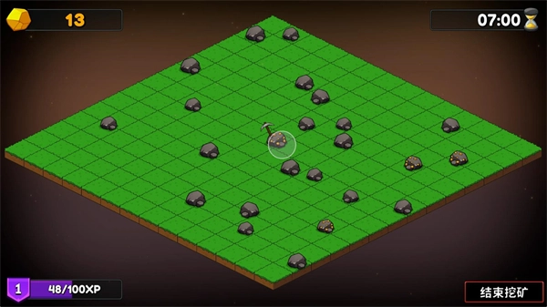 游戏启动后,点击矿石即可开展挖矿操作,悬浮球覆盖区域内的所有矿石都能被采集到。