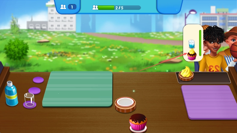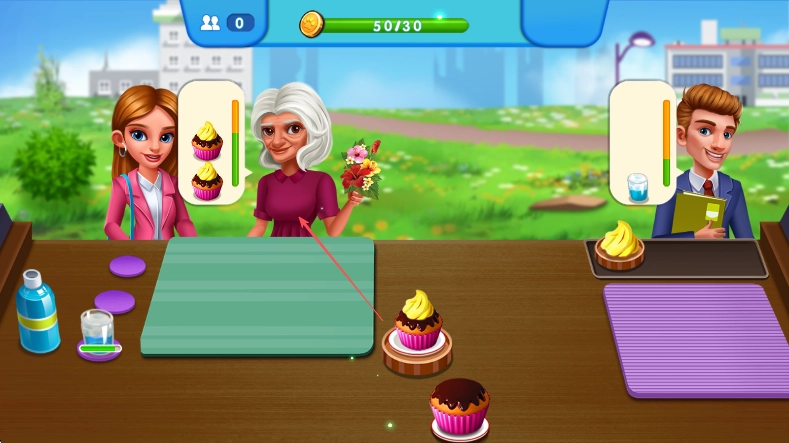 1、启动游戏后,留意右上角的进度条以掌握顾客排队状态,同时观察顾客的具体需求,例如身着黄色服装的顾客可能需要一份淋有巧克力酱的纸杯蛋糕搭配一杯水。