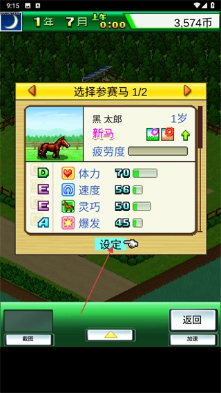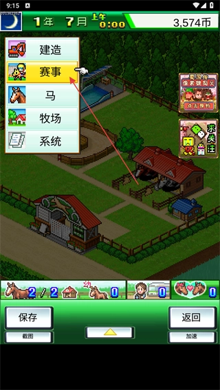 1、游戏的核心玩法是培育马匹参与赛事,以此提升牧场的知名度,你可以点击菜单栏里的赛事选项,查看当前的赛事安排。