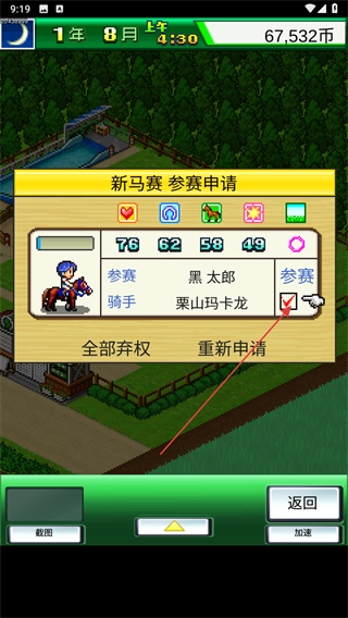 3、报名时需选定参赛马匹,应依据马匹的各项属性评分来挑选适合参赛的马匹。
