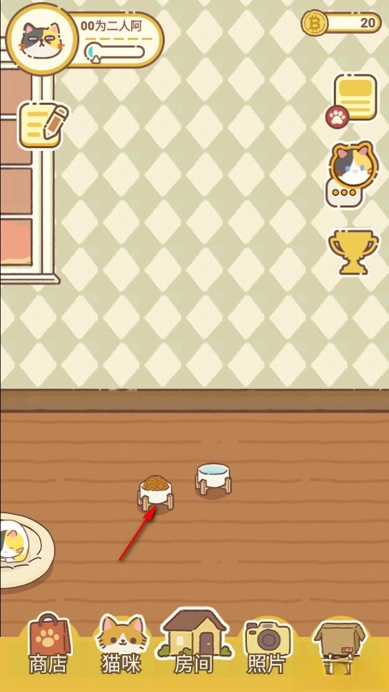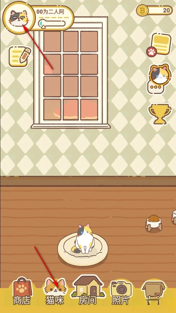 5、左上角的猫咪头像代表着猫咪的心情状态,其下方的猫咪文字则用于显示猫咪与玩家之间的亲密度。