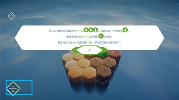 4、每三张相同的改良牌放在一起时,会生成一片栖息地,能额外提升1点和谐值。