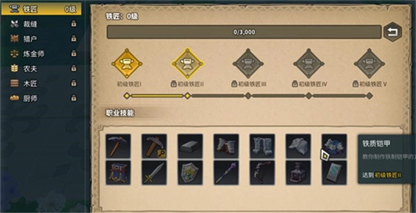 5、关于技能选择,新人往往会在学什么技能这件事上犯难,这里我推荐大家优先考虑“御三家”技能——铁匠、裁缝和猎户是一定要学的。毕竟如果不学这些,就没法采集织物、矿物和皮革原料。别觉得自己是建筑党就不需要装备,没有合适的装备,你不仅采集不到高级材料,连高级建筑制作书都拿不到手,而且很多建筑原材料本身就需要用到布料和矿物来制作。所以建议先把这三项采集技能点上,至少都先点到1级。