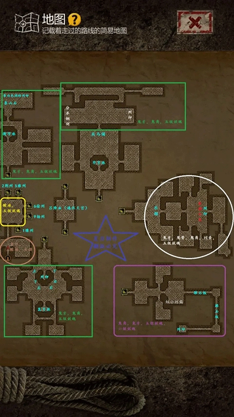 全图按房间顺序探索就不会卡关,我已标记好房间序号,只有雕字石块和华字珠需要先前往下一个房间获取后,再返回当前房间开启机关。【每个州对应的房间里肯定藏有州印,州印的具体位置我都在图里标注清楚了,大家可以自行查看】PS:建议先在主厅刷足材料,把几个角色升到三星,在这之前遇到盾兵就赶紧跑,目前打不过,千万别硬拼。