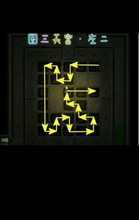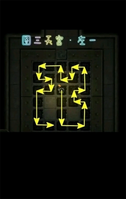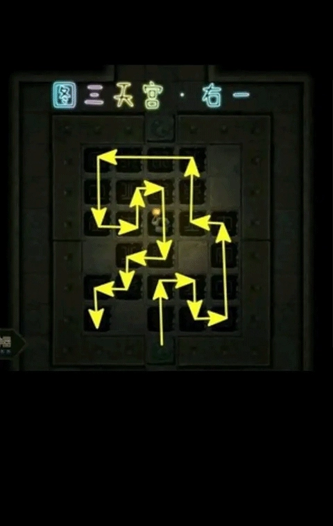 4、石像房间:这里有两个将军石像和四个圣兽石像,它们的作用都是开路,建议优先处理房间内的踩石板机关。有石板的区域属于无暗雷区,大家可以放心踩踏。不过房间内的小房间以及塌陷的神秘区域仍存在暗雷,需要留意。踩石板的规则依旧是踩亮后不能走回头路,在此附上示意图供大家参考。【PS:不一定非要从入口开始踩并在入口结束,起始位置可以任选,往回走一步就能重置所有石板,所以完全可以从某个单独的分支从头开始踩。】