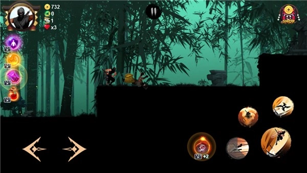 2、游戏操作界面的左侧是用于控制角色左右移动的按钮,右侧则分布着跳跃、攻击、冲刺以及隐身这几个技能按钮。