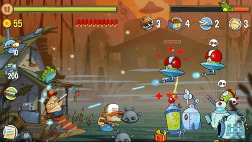 游戏里的飞鸟与不明飞行物被击毁后会掉落物品,礼盒类物件只需点击就能开启获取其中的道具,初期关卡能得到的物品包括爆炸装置、火焰投掷瓶和货币类道具。