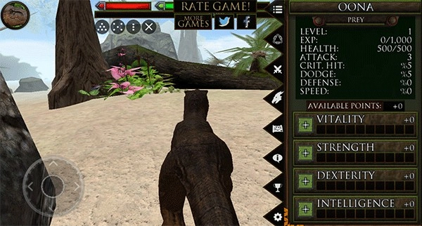 点击左上角的恐龙图标能够打开更多界面,就像下面这张图展示的那样,玩家可以查看自身的等级和经验值。界面右下方显示着生命值、力量以及敏捷这些属性,玩家还能点击地图标识来了解自己当前所处的位置。