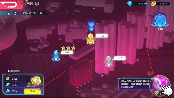 战役界面的右上角设有地图功能,玩家可通过该功能跳转至其他大关卡,也能重新挑战未达成满星评价的关卡。
