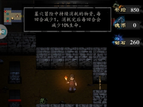 下墓倒斗时最关键的是“补给”数值,之前提过这是回合制游戏,补给的数值就代表本局能进行的最大回合数,一旦补给消耗完,每回合都会损失10%生命值,这基本就意味着失败了。不过副本关卡里会有能恢复补给的道具,记得平时备1-2个补给品是最稳妥的做法。