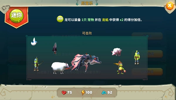 迷你龙能携带1只宠物,并且在龙焰状态下得分会翻倍(×2)。
