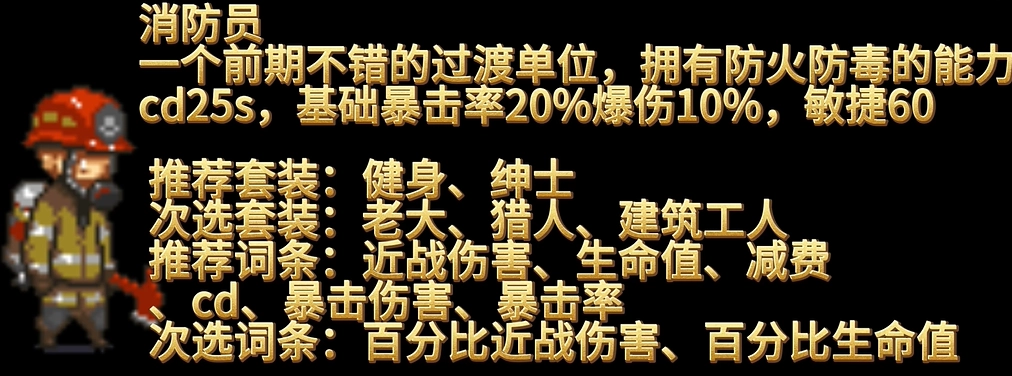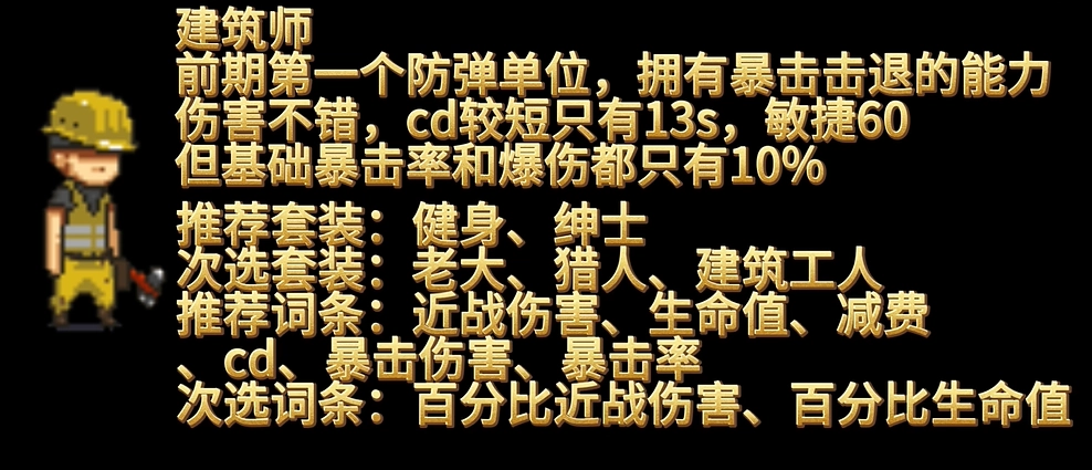 建筑师:要配备防弹衣,它是游戏前期唯一具备防弹能力的单位,在挑战第三大关时推荐选用。