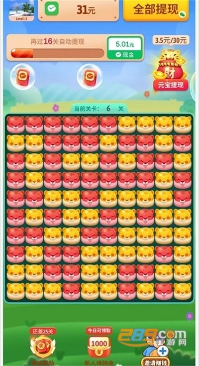 这款游戏的操作逻辑清晰明了,你只需用手指轻点屏幕,选中花色一致的小老虎图案,这些方块就会立刻消除。每次顺利完成消除操作,都能让你获得相应的积分,还能解锁令人心动的红包福利。