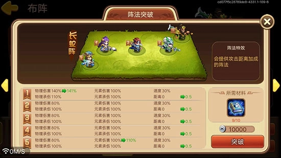 各类阵法支持等级提升,部分阵法升级后能解锁物理或元素伤害增益效果及专属阵法特性。其中长蛇阵升级后的特性可额外拓展0.5单位的作用范围,这一效果使其相比其他阵法具备一定独特优势。