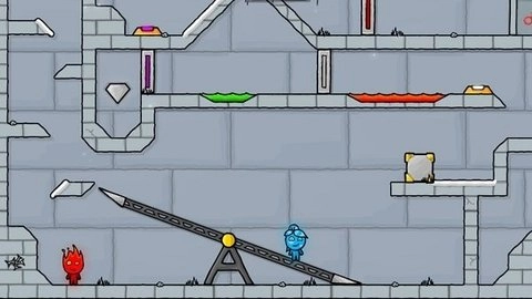 然后向上行进,这时会发现对应的池子颜色恰好与第1层相反,所以跳上去的时候要分清楚该怎么走——此时冰娃在左边,火娃就往右边去,接着进入池子收集对应的钻石。