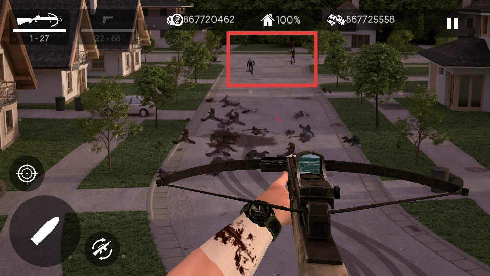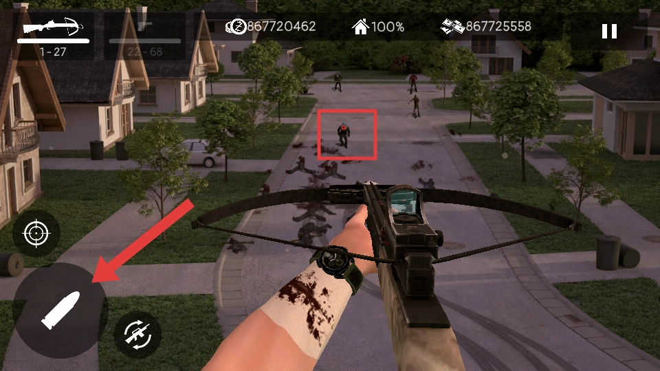 当准心对准僵尸时,点击左侧的弹药图标,即可发射弩箭对僵尸发起攻击。