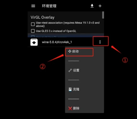 再回到模拟器界面,看到下方wine-5.0.4旁边出现了三个点,点击这三个点后选择【启动】选项。