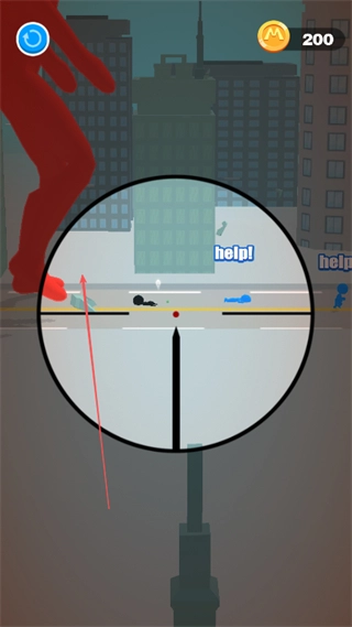 通过狙击镜精准锁定巨人目标,避开带有蓝色“help!”标识的平民区域,保证射击能够准确命中巨人。