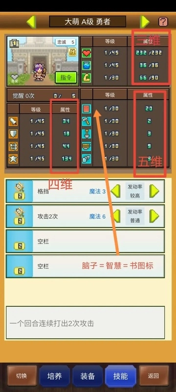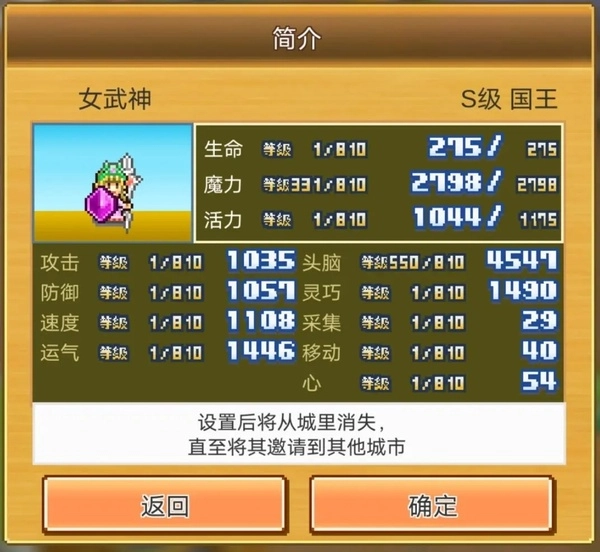 二代角色的属性完全依赖运气,就像一场“生育赌博”,关键看生下的孩子蓝量和智力这两项数值是否足够高。而之所以设定S级暗法这个角色,一方面是为了能和国王进行配对繁衍,另一方面也是因为一代角色会压制蓝量属性,同时给那些刷不到S级勇者和S级士兵的玩家,提供了另一条可行的发展路径。