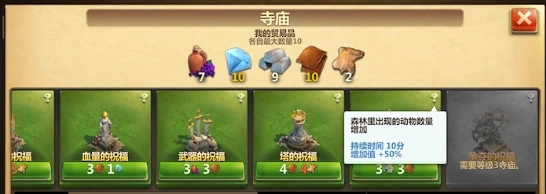 由于公鹿十分稀有,刷新间隔又很长,玩家可以在2级寺庙里用3个金属和3张皮革兑换动物祝福,这能让10分钟内动物出现的数量增多,同时提升公鹿的出现概率。