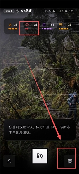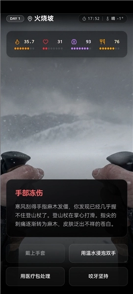 顶部区域会实时展示体温、体能值、精神力、饱腹度等核心数据,点击足迹图标即可推动行程进度