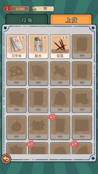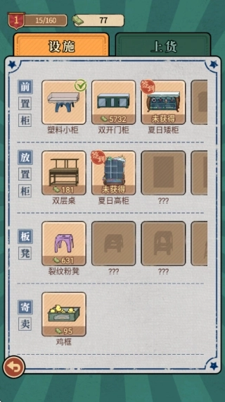 3.点击底部菜单栏的“货架”选项,能够解锁更多商品品类和陈列道具,从而丰富店铺的商品结构。