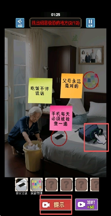 2、要在120秒内找出12处细思极恐的异常之处,完成这项挑战才能通关。