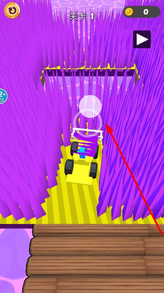 操控黄色收割机在紫色草丛区域行驶,沿箭头方向前进,收割草丛开辟道路,注意避开障碍物。