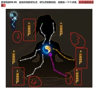 5.偷学武功和一层武功全部练满你的修为等级应该在100左右,100修为等级对应100修为点,前期修为点先打通少阳脉,再打通会阴脉这两个按顺序打通,依次放入气海激活属性吸血效果,这两个脉打通之后防御700打中原的怪基本不费药很关键,其他的经脉你们随意根据自己的需求点。老板娘多买几个洗髓丹随时重置经脉用