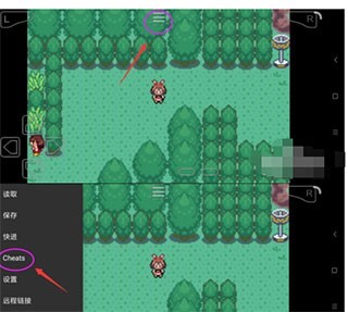 1、在手机上打开gba模拟器,启动游戏后,点击对应的图标,选择Cheats选项;