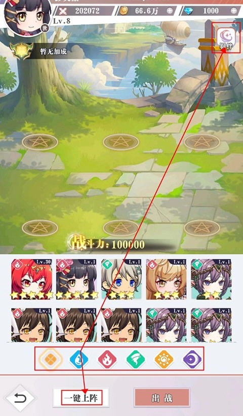 在开启冒险之前,玩家能够对阵容进行调整,可依据英雄的羁绊来操作,点击右上角的羁绊选项就能查看相关信息,也可以选择点击左下角的“一键上阵”功能。