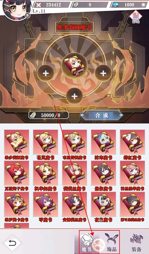 4、除了装备合成外,玩家还能点击下方的“饰品”与“魔书”选项,开展装饰品和魔法书的合成升级操作。
